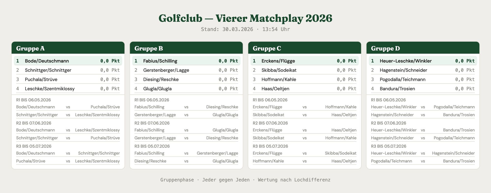 Die Verteilung der Teams über die Gruppen wird nach aktuellem HCPI vorgenommen (Summe beider Spielenden). Je nach dem wie viele Teams sich angemeldet haben, ergeben sich unterschiedliche Gruppengrößen. Alle Teams werden mindestens zwei Matches bestreiten können.
